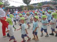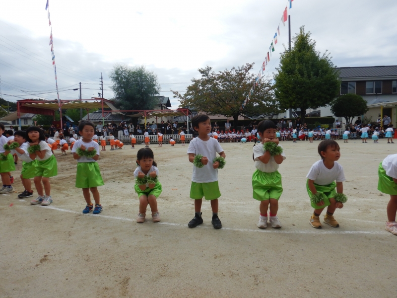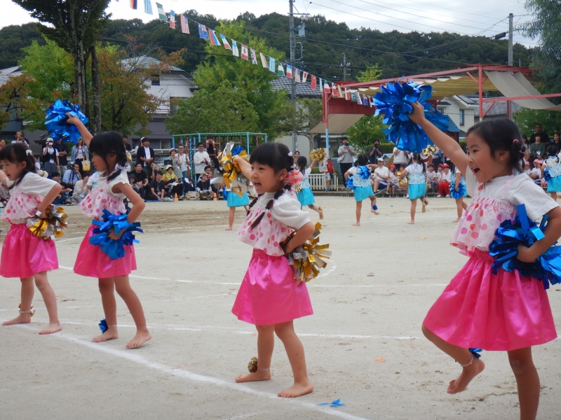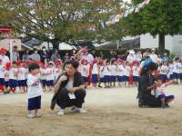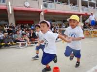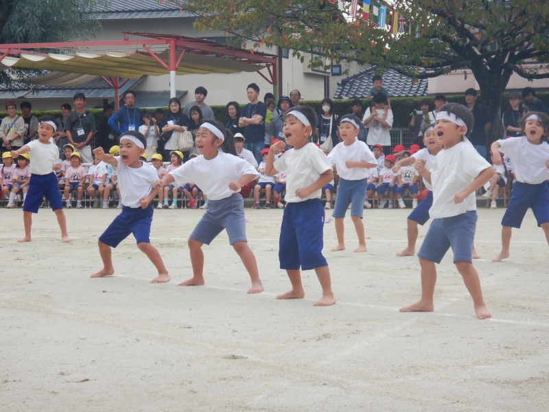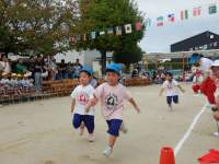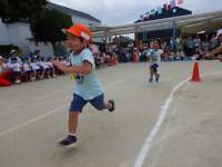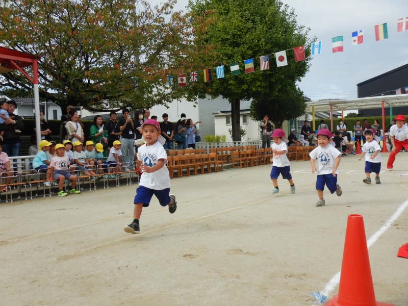年長さんの力強いエールで幕を開けた運動会は、かわいい満三歳さんのかけっこ、元気いっぱいの年少さん、